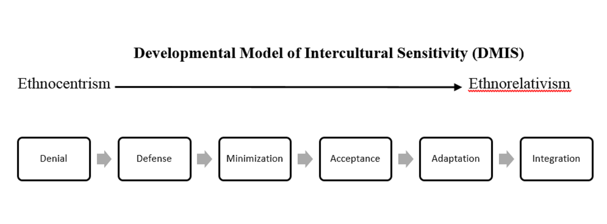 Defense– recognition of cultural difference coupled with negative evaluations of those whose culture is different from one’s own culture; derogation (belittling other cultures); superiority (looking down on other cultures; prejudice); reversal (looking down on one’s own culture).